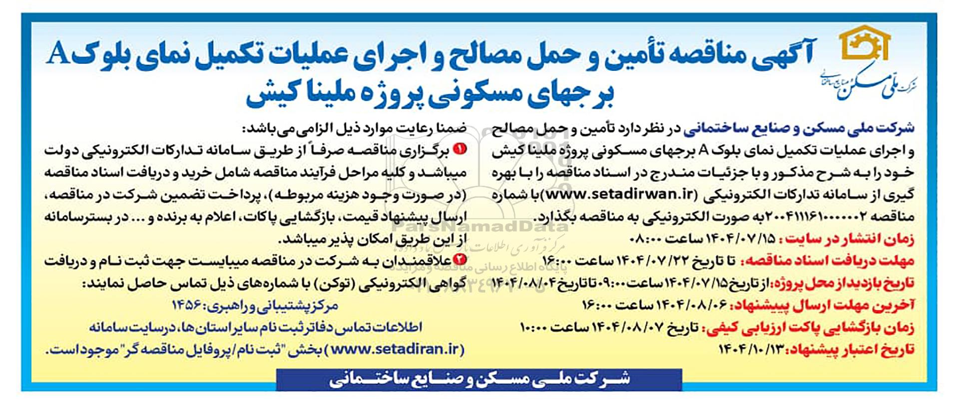 شرکت ملی مسکن و صنایع ساختمانی در نظر دارد تأمین و حمل مصالح و اجرای عملیات تکمیل نمای بلوک A برجهای مسکونی پروژه ملینا کیش خود را به شرح مذکور و با جزئیات مندرج در اسناد مناقصه را با بهره گیری از سامانه تدارکات الکترونیکی (ستاد ایران) با شماره مناقصه 2004111610000002 به صورت الکترونیکی به مناقصه بگذارد.