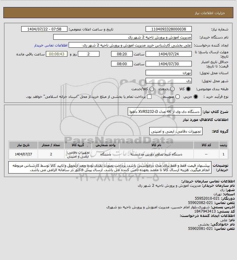 نام دستگاه خریدار:مدیریت اموزش و پرورش ناحیه 2 شهر ری