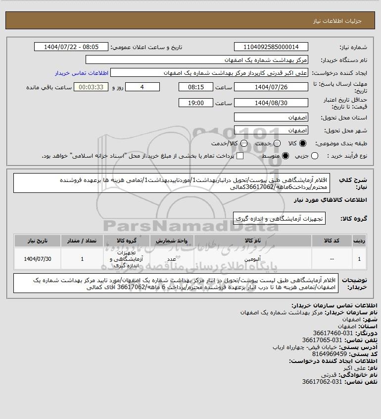 نام دستگاه خریدار:مرکز بهداشت شماره یک اصفهان