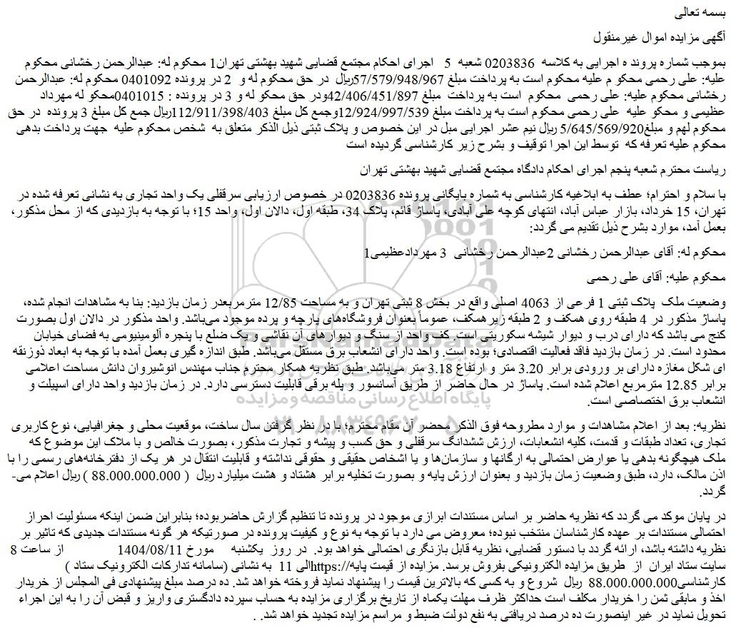 بموجب شماره پروند ه اجرایی به کلاسه  0203836 شعبه  5   اجرای احکام مجتمع قضایی شهید بهشتی تهران1 محکوم له: عبدالرحمن رخشانی محکوم علیه: علی رحمی محکو م علیه محکوم است به پرداخت مبلغ 57/579/948/967ریال  در حق محکوم له و  2 در پرونده 0401092 محکوم له: عبدالرحمن رخشانی محکوم علیه: علی رحمی  محکوم  است به پرداخت  مبلغ 42/406/451/897ودر حق محکو له و 3 در پرونده : 0401015محکو له مهرداد عظیمی و محکو علیه  علی رحمی محکوم است به پرداخت مبلغ 12/924/997/539وجمع کل مبلغ 112/911/398/403ریال جمع کل مبلغ 3 پرونده  در حق محکوم لهم و مبلغ5/645/569/920 ریال نیم عشر اجرایی مبل در این خصوص و پلاک ثبتی ذیل الذکر متعلق به  شخص محکوم علیه  جهت پرداخت بدهی محکوم علیه تعرفه که  توسط این اجرا توقیف و بشرح زیر کارشناسی گردیده است