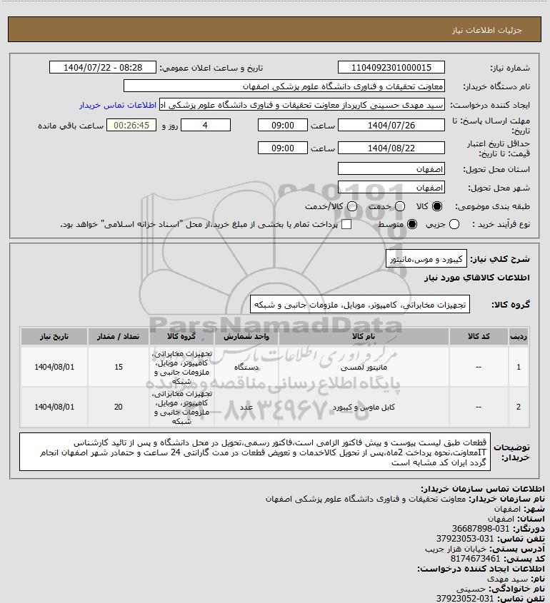 | 2 | -- | کابل ماوس و کیبورد | عدد | تجهیزات مخابراتی، کامپیوتر، موبایل، ملزومات جانبی و شبکه | 20 | 1404/08/01 |