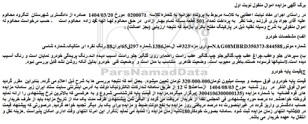 در راستای اجرای مفاد نیابت اعطایی به کلاسه مربوط به پرونده اجرائیه به شماره کلاسه 0200071 مورخ 1404/03/20 صادره از دادگستری شهرستان لنگرود محکوم علیه آقای جواد یاری فرزند رضا نظر به پرداخت تعداد 501 قطعه سکه تمام بهار ازادی در حق محکوم لها الهه محمد زاده محکوم است ، حسب درخواست محکوم له اموال منقولی به شرح وسیله نقلیه ذیل در پارکینگ مفتح باکری بازدید که نتیجه ارزیابی (بجز اصالت) :