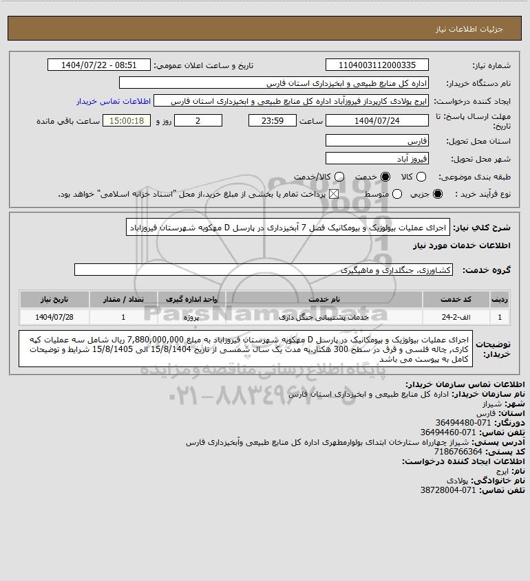 شرح کلی نیاز: اجرای عملیات بیولوژیک و بیومکانیک فصل 7 آبخیزداری در پارسل D مهکویه شهرستان فیروزاباد