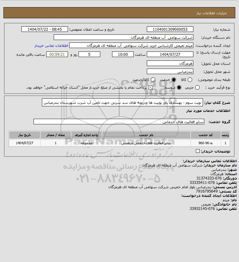 شرح کلی نیاز: نوبت سوم - بهسازی پاور یونیت ها ودریچه های سد سرنی جهت تامین آب شرب شهرستان بندرعباس