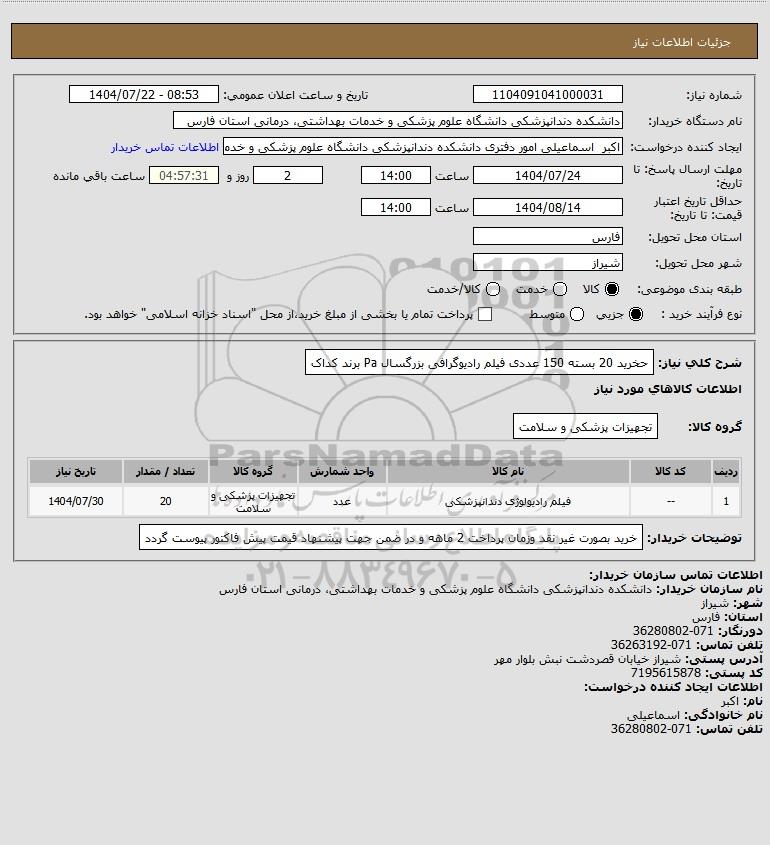 شرح کلی نیاز: حخرید 20 بسته 150 عددی فیلم رادیوگرافی بزرگسال Pa برند کداک