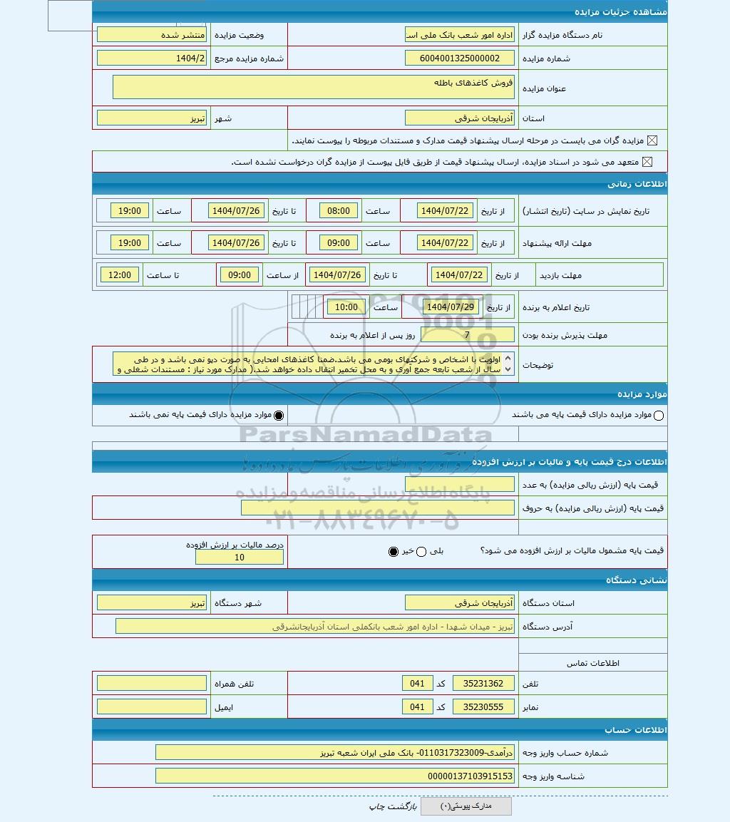 نام دستگاه مزایده گزار | اداره امور شعب بانک ملی استان آذربایجان شرقی | وضعیت مزایده | منتشر شده | |