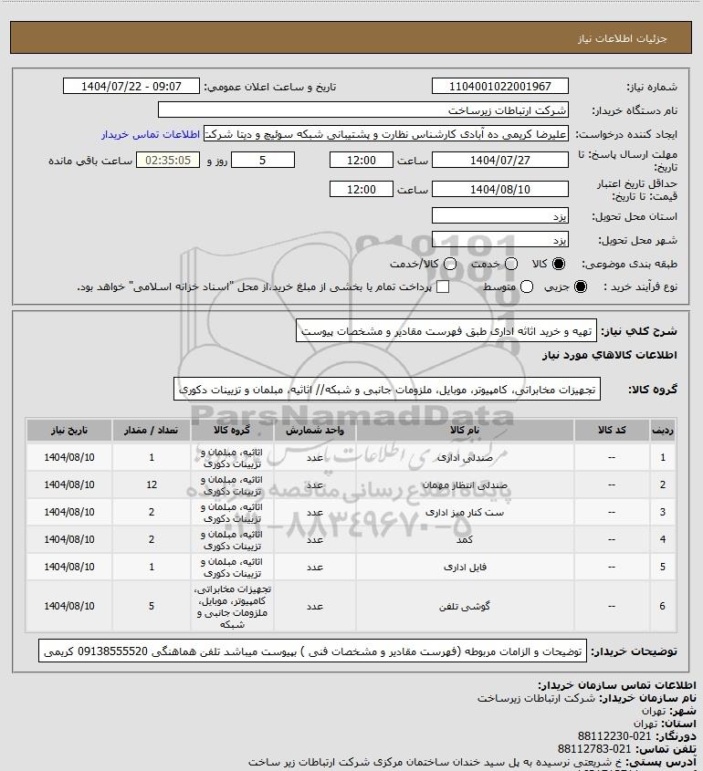 | 5 | -- | فایل اداری | عدد | اثاثیه، مبلمان و تزیینات دکوری | 1 | 1404/08/10 |