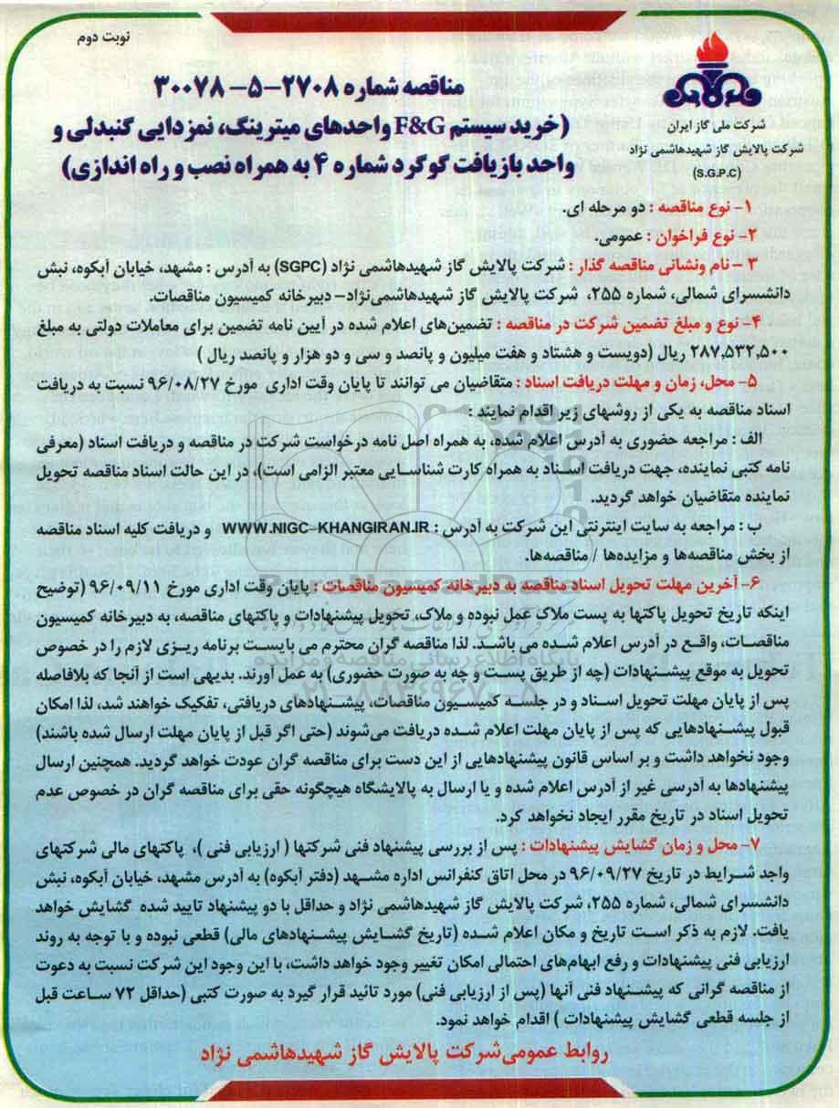 محل و زمان گشایش پیشنهادات : پس از بررسی پیشنهاد فنی شرکتها (ارزیابی فنی) پاکتهای مالی شرکتهای واجد شرایط در تاریخ 96.9.27در محل اتاق کنفرانس اداره مشهد دفتر آبکوه به آدرس مشهد ـ خیابان آبکوه نبش دانشسرای شمال ـ شماره 255 ـ شرکت پالایش گاز شهید هاشمی نژاد و حداقل با دو پیشنهاد تایید شده گشایش خواهد یافت . لازم به ذکر است تاریخ و مکان اعلام شده تاریخ گشایش پیشنهادهای مالی قطعی نبوده و با توجه به روند ارزیابی فنی پیشنهادات و رفع ابهام های احتمالی امکان تغییر وجود خواهد داشت با این وجود این شرکت نسبت به دعوت از مناقصه گرانی که پیشنهاد فنی آنها پس از ارزیابی فنی مورد تائید قرار گیرد به صورت کتبی حداقل 72 ساعت قبل از جلسه قطعی گشایش پیشنهادات اقدام خواهد نمود.