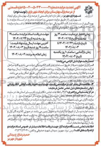 شهرداری مهریز در نظر دارد اجاره قسمتی از عرصه پارک بهارستان برای ایجاد شهربازی را از طریق مزایده عمومی و با جزئیات مندرج در اسناد مزایده، با بهره گیری از سـامانه تدارکات الکترونیکی دولت سایت ستاد ایران با شماره مزایده 5004005043000002 به صورت الکترونیکی واگذار نماید.
