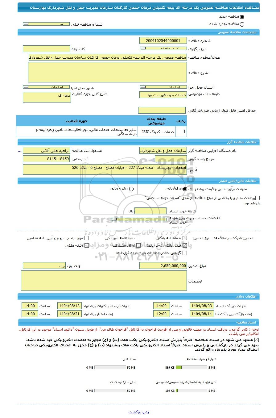 | نام دستگاه اجرایی مناقصه گزار | سازمان حمل و نقل شهرداری بهارستان | مسئول ثبت مناقصه | ابراهیم علی آقائی |