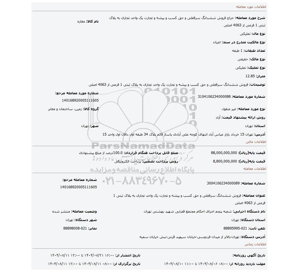 عنوان معامله: فروش ششدانگ سرقفلی و حق کسب و پیشه و تجارت یک واحد تجاری به پلاک ثبتی 1 فرعی از 4063 اصلی