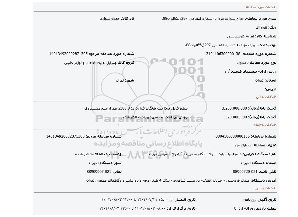 مزایده عمومی مزایده سواری مزدا به شماره انتظامی 297ق65ایران88 برگزار میگردد. از کلیه افراد متخصص و شرکت‌های واجد شرایط دعوت به عمل می‌آید تا در این مزایده با کد خبرگزاری پارس نماد : 9696245 شرکت نمایند تاریخ شروع مزایده : 1404/07/21 مهلت شرکت در مزایده: تا پایان روز 1404/08/03 مکان برگزاری اموال واگذاری استان‌های مزایدات استان تهران و دسته‌بندی‌های مربوط به این حراجی انواع خودرو سبک میباشد.