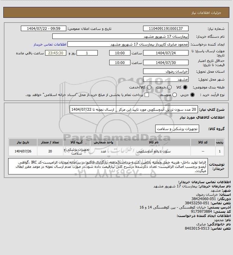 | 1 | -- | سوزن یا پانچ آندوسکوپی | عدد | تجهیزات پزشکی و سلامت | 20 | 1404/07/26 |