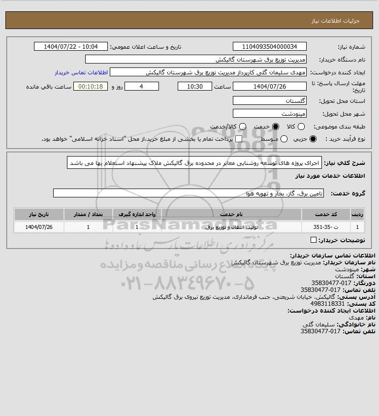 شرح کلی نیاز: اجرای پروژه های توسعه روشنایی معابر در محدوده برق گالیکش ملاک پیشنهاد استعلام بها می باشد
