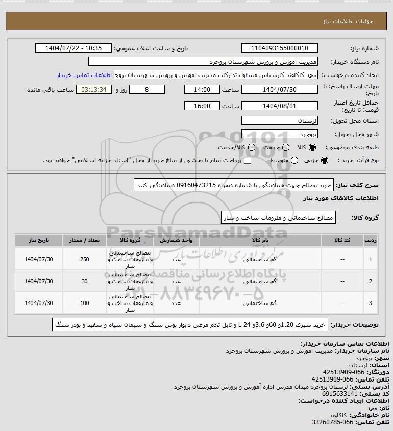 شرح کلی نیاز: خرید مصالح جهت هماهنگی با شماره همراه 09160473215 هماهنگی کنید