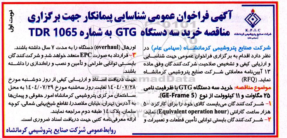 آگهی فراخوان عمومی شناسایی پیمانکار جهت برگزاری مناقصه خرید سه دستگاه GTG به شماره 1065 TDR؟