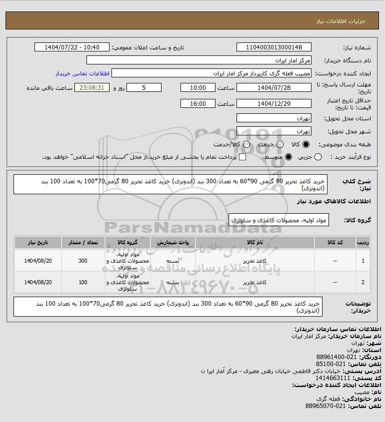 | 2 | -- | کاغذ تحریر | بسته | مواد اولیه، محصولات کاغذی و سلولزی | 100 | 1404/08/20 |