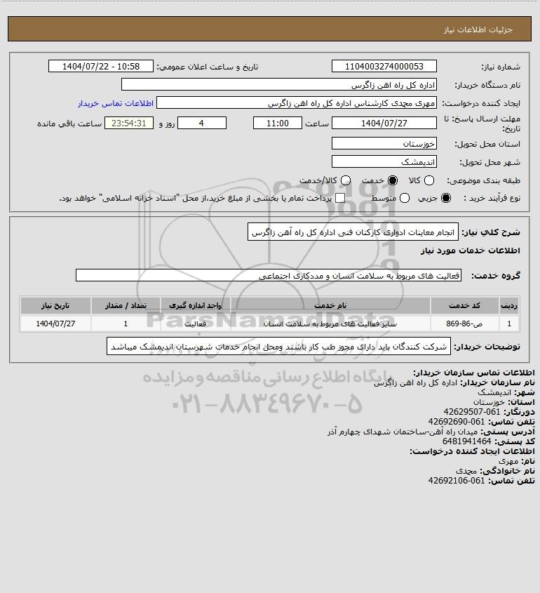 شرح کلی نیاز: انجام معاینات ادواری کارکنان فنی اداره کل راه آهن زاگرس