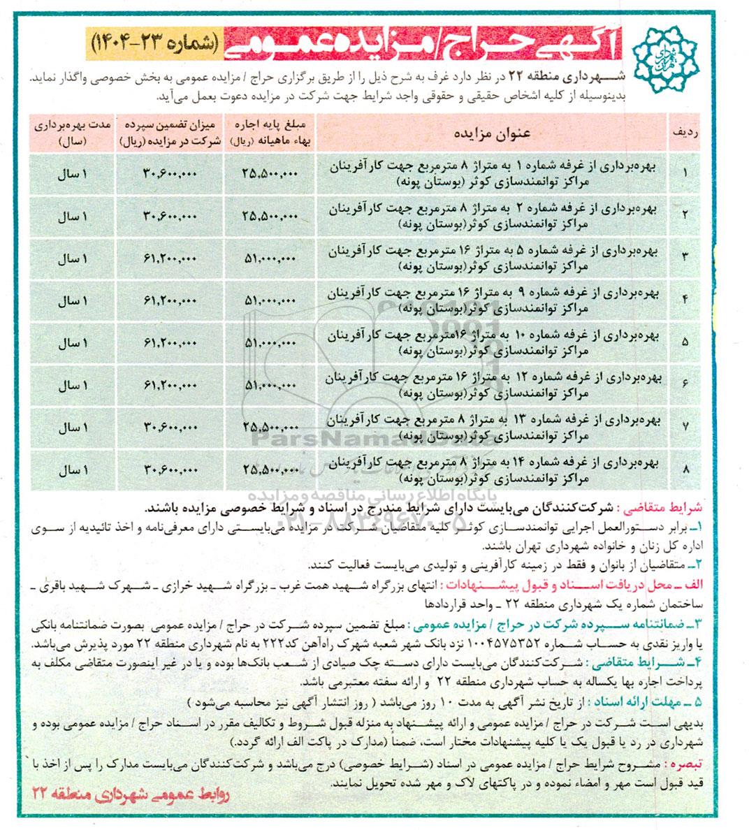 شهرداری منطقه 22 در نظر دارد غرف به شرح ذیل را از طریق برگزاری حراج / مزایده عمومی به بخش خصوصی واگذار نماید. بدینوسیله از کلیه اشخاص حقیقی و یا حقوقی واجد شرایط مندرج در اسناد جهت شرکت در مزایده دعوت بعمل می آید.