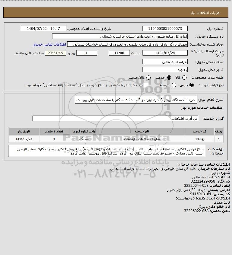 نام دستگاه خریدار:اداره کل منابع طبیعی و ابخیزداری استان خراسان شمالی