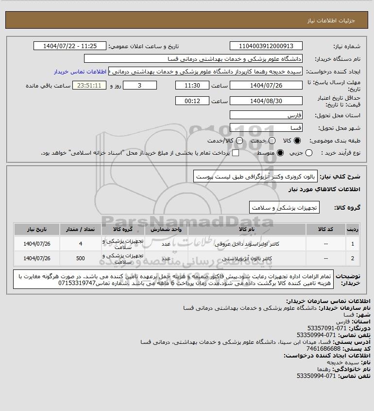 شرح کلی نیاز: بالون کرونری وکتتر آنژیوگرافی طبق لیست پیوست