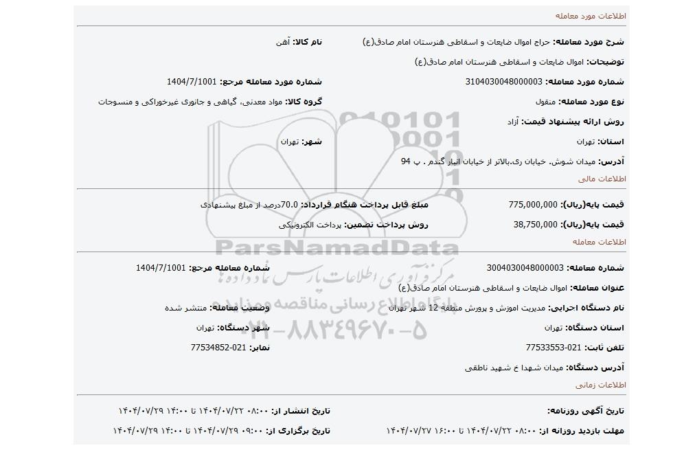 عنوان معامله: اموال ضایعات و اسقاطی هنرستان امام صادق(ع)