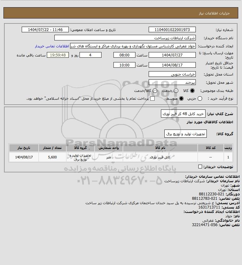 شرح کلی نیاز: خرید کابل 48 کر فیبر نوری