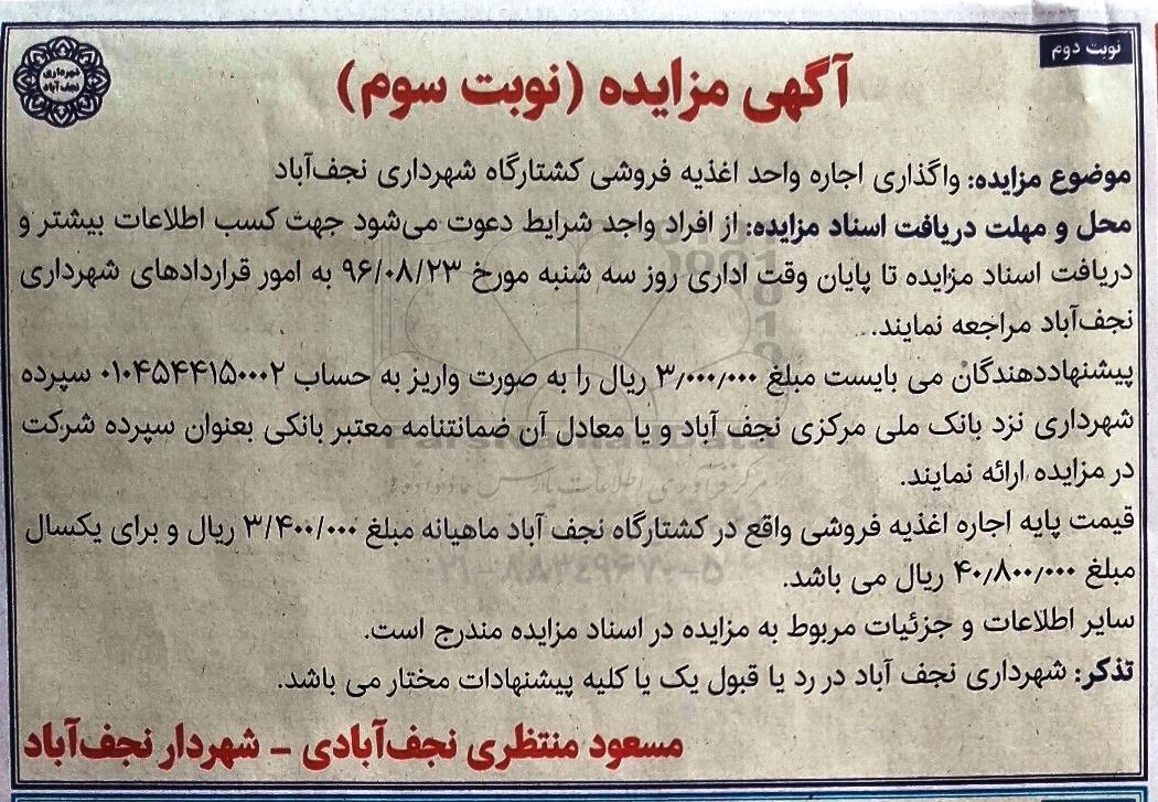 موضوع مزایده : واگذاری اجاره واحد اغذیه فروشی کشتارگاه شهرداری نجف آباد