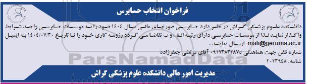 دانشکده علوم پزشکی گراش در نظر دارد حسابرسی صورتهای مالی سال 1404 خود را به موسسات حسابرسی واجد شرایط واگذار نماید . لذا از موسسات حسابرسی دارای رتبه الف و ب تقاضا می گردد رزومه کاری خود را تا تاریخ1404.7.30 به ایمیل ارسال نمایند mali@gerums.ac.ir ارسال نمایند.