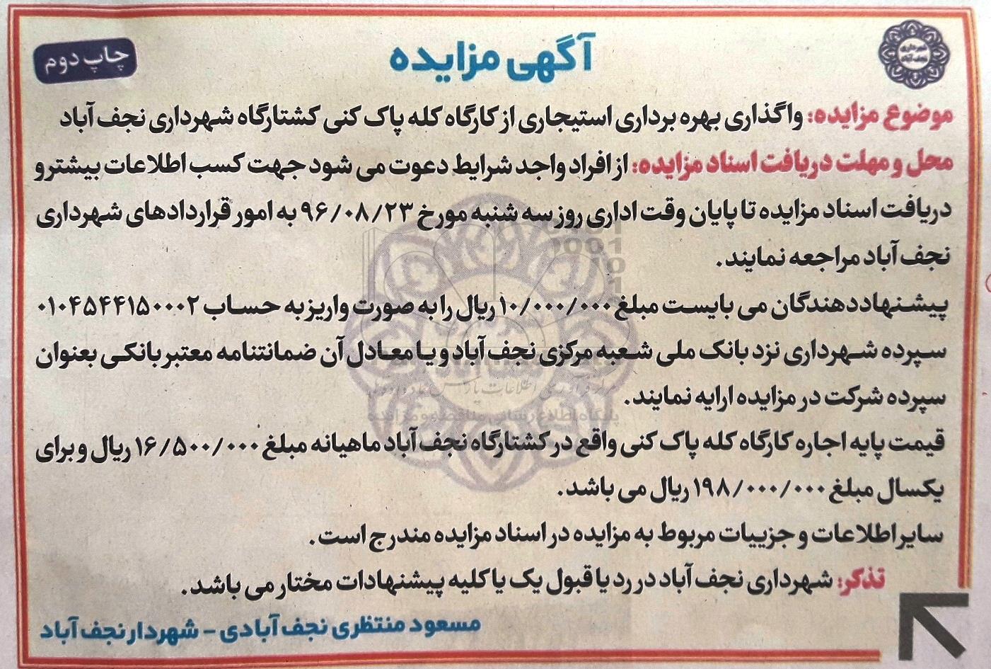 موضوع مزایده: واگذاری بهره برداری استیجاری از کارگاه کله پاک کنی کشتارگاه شهرداری نجف آباد