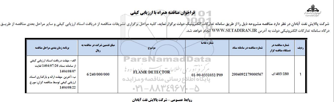 | 1 | ک .403.180 | 2004092179000567 | 01-90-0331032.P09 | FLAME DETECTOR | 6.240.000.000 | الف- مهلت دریافت اسناد ارزیابی کیفی از سامانه ستاد 1404.07.26 لغایت 1404.08.07 ب - آخرین مهلت ارائه و بارگذاری اسناد ارزیابی کیفی توسط مناقصه گران مورخ 1404.08.22 |