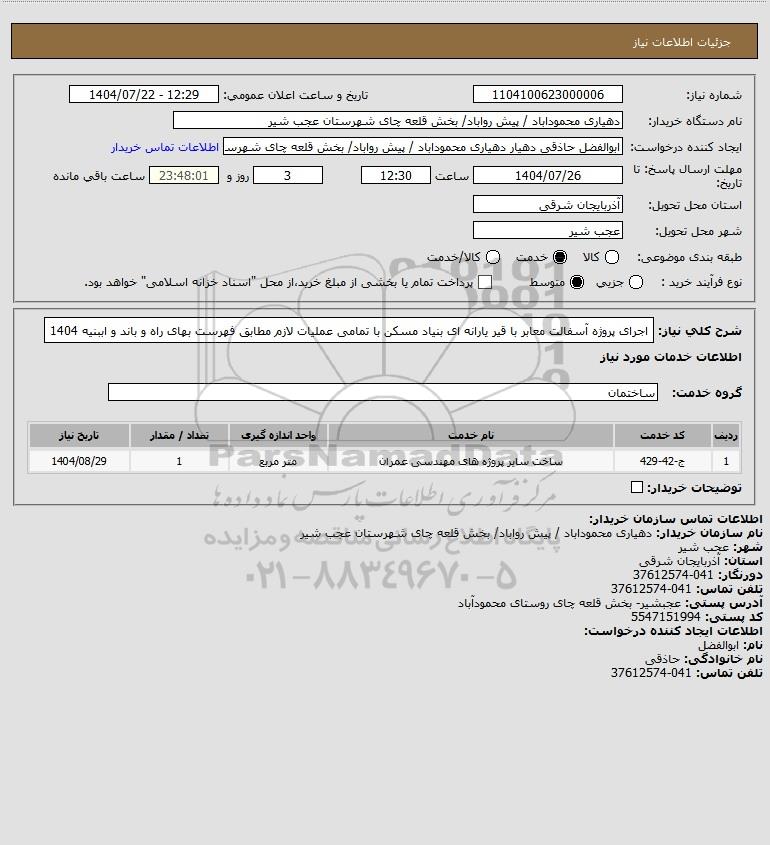 نام دستگاه خریدار:دهیاری محموداباد / پیش رواباد/ بخش قلعه چای شهرستان عجب شیر