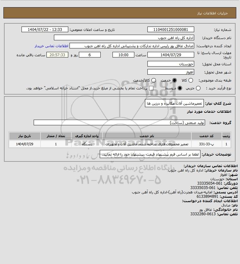 شرح کلی نیاز: تعمیرماشین آلات مکانیزه و درزین ها