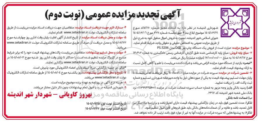 آگهی تجدید مزایده عمومی ؟ نوبت دوم