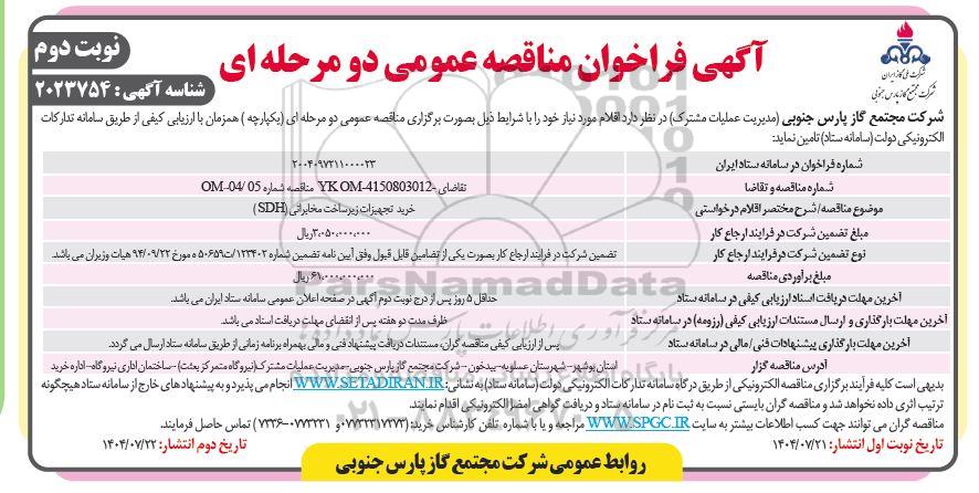 شرکت مجتمع گاز پارس جنوبی (مدیریت عملیات مشترک) در نظر دارد اقلام مورد نیاز خود را با شرایط ذیل بصورت برگزاری مناقصه عمومی دو مرحله ای همزمان با ارزیابی کیفی بصورت یکپارچه از طریق سامانه تدارکات الکترونیکی دولت سامانه ستادتامین نماید