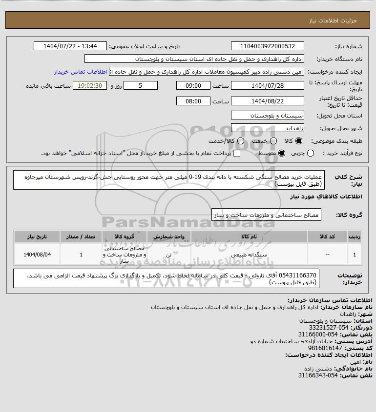 شرح کلی نیاز: عملیات خرید مصالح سنگی شکسته با دانه بندی 19-0 میلی متر جهت محور روستایی جش-گزند-روپس شهرستان میرجاوه (طبق فایل پیوست)