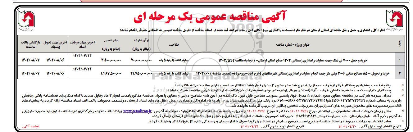 خرید و حمل 7000 تن نمک جهت عملیات راهداری زمستانی 1404 سطح استان لرستان تجدید مناقصه  -1404.59 تولیدکننده یا رتبه 5 راه 70.000.000.000 3.500.000.000 1404.7.24  1404.8.6  1404.8.7