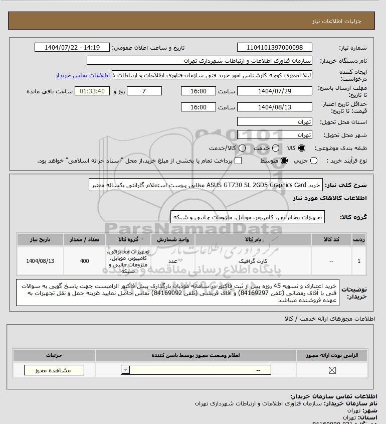 | 1 | -- | کارت گرافیک | عدد | تجهیزات مخابراتی، کامپیوتر، موبایل، ملزومات جانبی و شبکه | 400 | 1404/08/13 |
