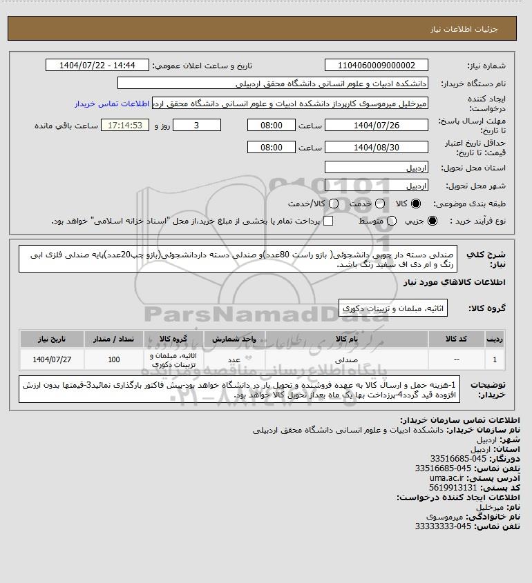 شرح کلی نیاز: صندلی دسته دار چوبی دانشجوئی( بازو راست 80عدد)و صندلی دسته داردانشجوئی(بازو چپ20عدد)پایه صندلی فلزی ابی رنگ و ام دی اف سفید رنگ باشد.