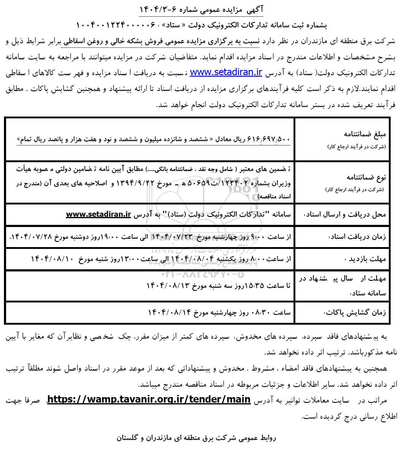 شرکت برق منطقه ای مازندران در نظر دارد نسبت به برگزاری مزایده عمومی فروش بشکه خالی و روغن اسقاطی برابر شرایط ذیل و بشرح مشخصات و اطلاعات مندرج در اسناد مزایده اقدام نماید. متقاضیان شرکت در مزایده میتوانند با مراجعه به سایت سامانه تدارکات الکترونیک دولت (ستاد) به آدرس ستاد ایران نسبت به دریافت اسناد مزایده و فهرست کالاهای اسقاطی اقدام نمایند. لازم به ذکر است کلیه فرآیندهای برگزاری مزایده از دریافت اسناد تا ارائه پیشنهاد و همچنین گشایش پاکات ، مطابق فرآیند تعریف شده در بستر سامانه تدارکات الکترونیک دولت انجام خواهد شد.