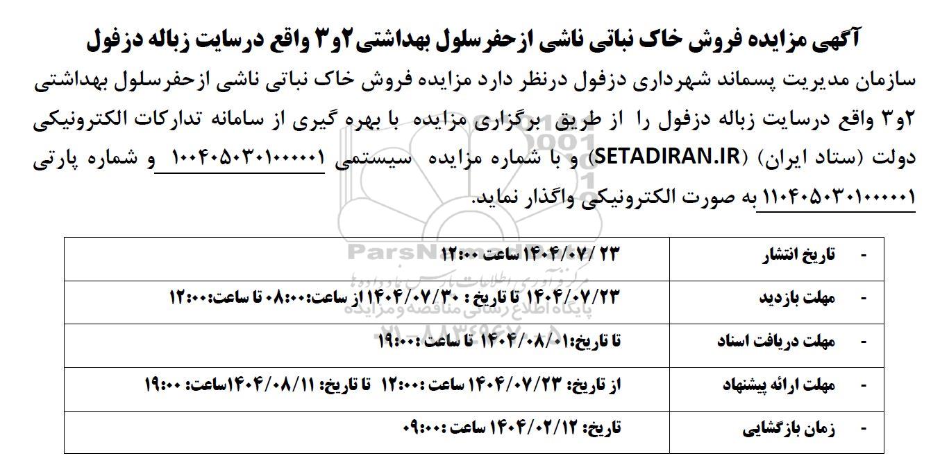 سازمان مدیریت پسماند شهرداری دزفول در نظر دارد مزایده فروش خاک نباتی ناشی از حفر سلول بهداشتی 2 و 3 واقع در سایت زباله دزفول را از طریق برگزاری مزایده با بهره گیری از سامانه تدارکات الکترونیکی دولت ستاد ایران و با شماره مزایده سیستمی 1004050301000001 و شماره پارتی 1104050301000001 به صورت الکترونیکی واگذار نماید.