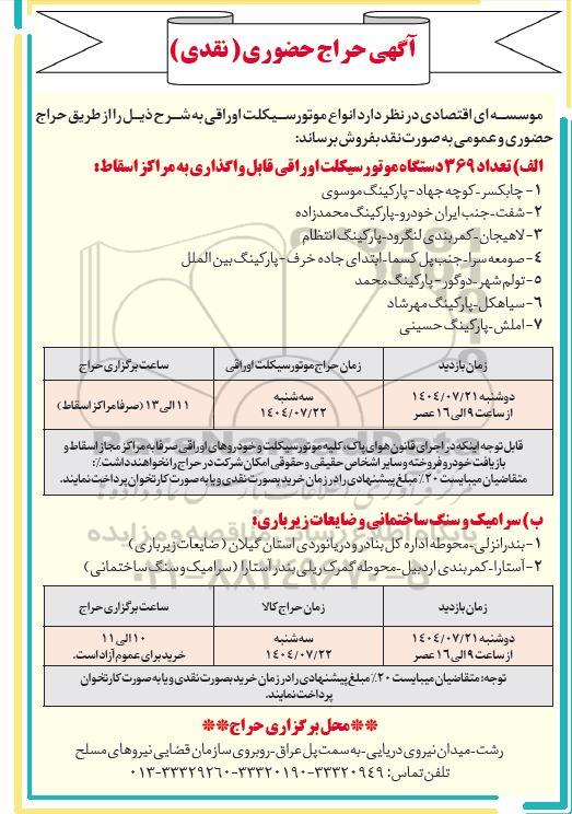 حراج حضوری (نقدی) تعداد 369 دستگاه موتور سیکلت اوراقی ، سرامیک و سنگ ساختمانی و ضایعات زیرباری