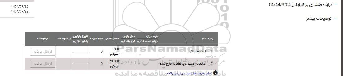 مزایده عمومی مزایده تخته ضایعاتی برگزار میگردد. از کلیه افراد متخصص و شرکتهای واجد شرایط دعوت به عمل میآید تا در این مزایده با کد خبرگزاری پارس نماد : 9699159 شرکت نمایند تاریخ شروع مزایده : 1404/07/22 مهلت شرکت در مزایده: تا پایان روز 1404/07/22 مکان برگزاری اموال واگذاری استانهای سایر و دستهبندیهای مربوط به این حراجی چوب, قطعات مس و برنج میباشد.