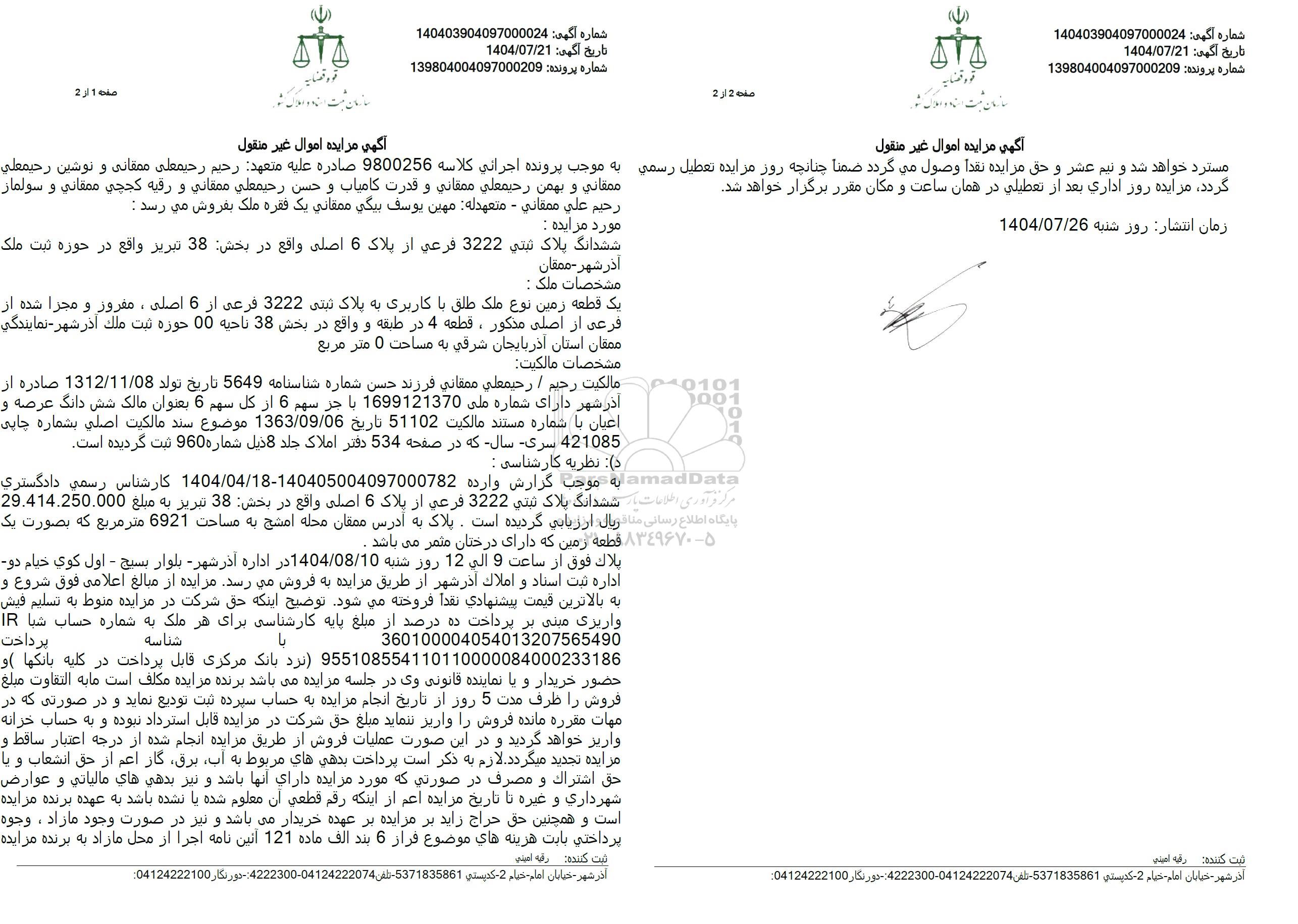 ششدانگ پلاک ثبتی 3222 فرعی از پلاک 6 اصلی واقع در بخش 38 تبریز به مبلغ 29.414.250.000 ریال ارزیابی گردیده است. پلاک به آدرس ممقان محله امشب به مساحت 6921 متر مربع که بصورت یک قطعه زمین که دارای درختان مثمر می باشد.