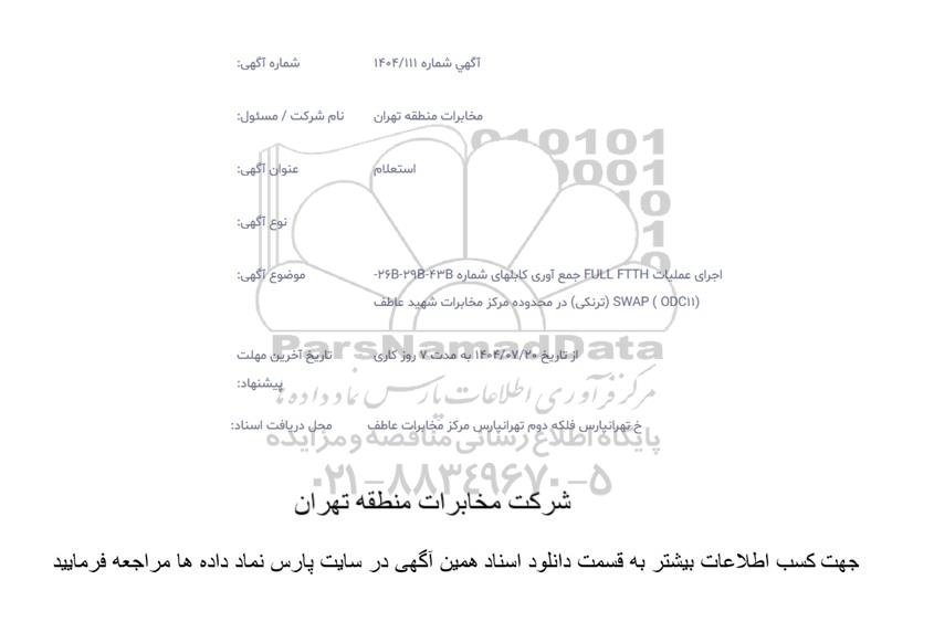 موضوع آگهی: اجرای عملیات FULL FTTH جمع آوری کابلهای شماره 43B-29B-26B