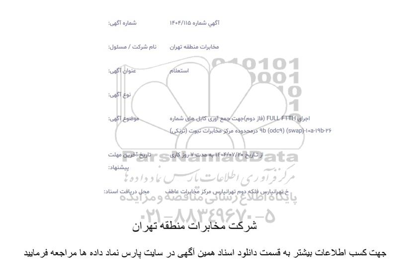 موضوع آگهی: اجرای FULL FTTH (فاز دوم) جهت جمع آوری کابل های شماره 9b (odc9) (swap)- 10a - 19b - 26 در محدوده مرکز مخابرات نبوت (ترنکی)