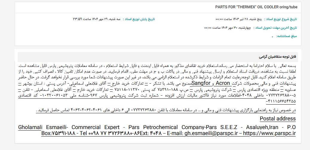 بسمه تعالی با سلام احتراما به استحضار می رساند. استعلام خرید تقاضای مذکور به همراه فایل ایندنت و فایل شرایط استعلام در سامانه معاملات پتروشیمی پارس قابل مشاهده است. لطفا نسبت به مشاهده دریافت اسناد استعلام و ارسال پیشنهاد فنی و مالی در پاکات ب و ج در مهلت مقرر اقدام فرمایید. در صورت عدم امکان تامین کالا . انصراف کتبی خود را از طریق سامانه اعلام کنید قابل توجه رعایت تمام الزامات و شرایط ذکر شده در استعلام الزامی میباشد در غیر این صورت پیشنهادات شما مورد بررسی قرار نخواهد گرفت. در حال حاضر پیشنهادات فنی و مالی محصولات شرکت Acron و Sangfor ممنوع میباشد با تشکر - تدارکات خرید خارج - آقای غلامعلی اسماعیلی آدرس پستی : استان بوشهر - عسلویه - منطقه ویژه اقتصادی پارس - شرکت پتروشیمی پارس - ص.ب 188 75391 کد پستی 11370 75118 - تدارکات خرید خارج - آقای غلامعلی اسماعیلی تلفن - 077372638805 داخلی 4048 اطلاعات مورد نیاز فاکتور مالیات ارزش افزوده شماره ثبت شرکت پتروشیمی پارس 967 شناسه ملی 10320061053 کد اقتصادی 411156654355