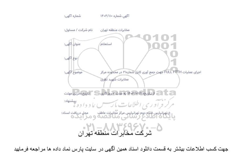 موضوع آگهی: اجرای عملیات FULL FTTH جهت جمع آوری کابل شماره 21 در محدوده مرکز مخابرات شهید نظری