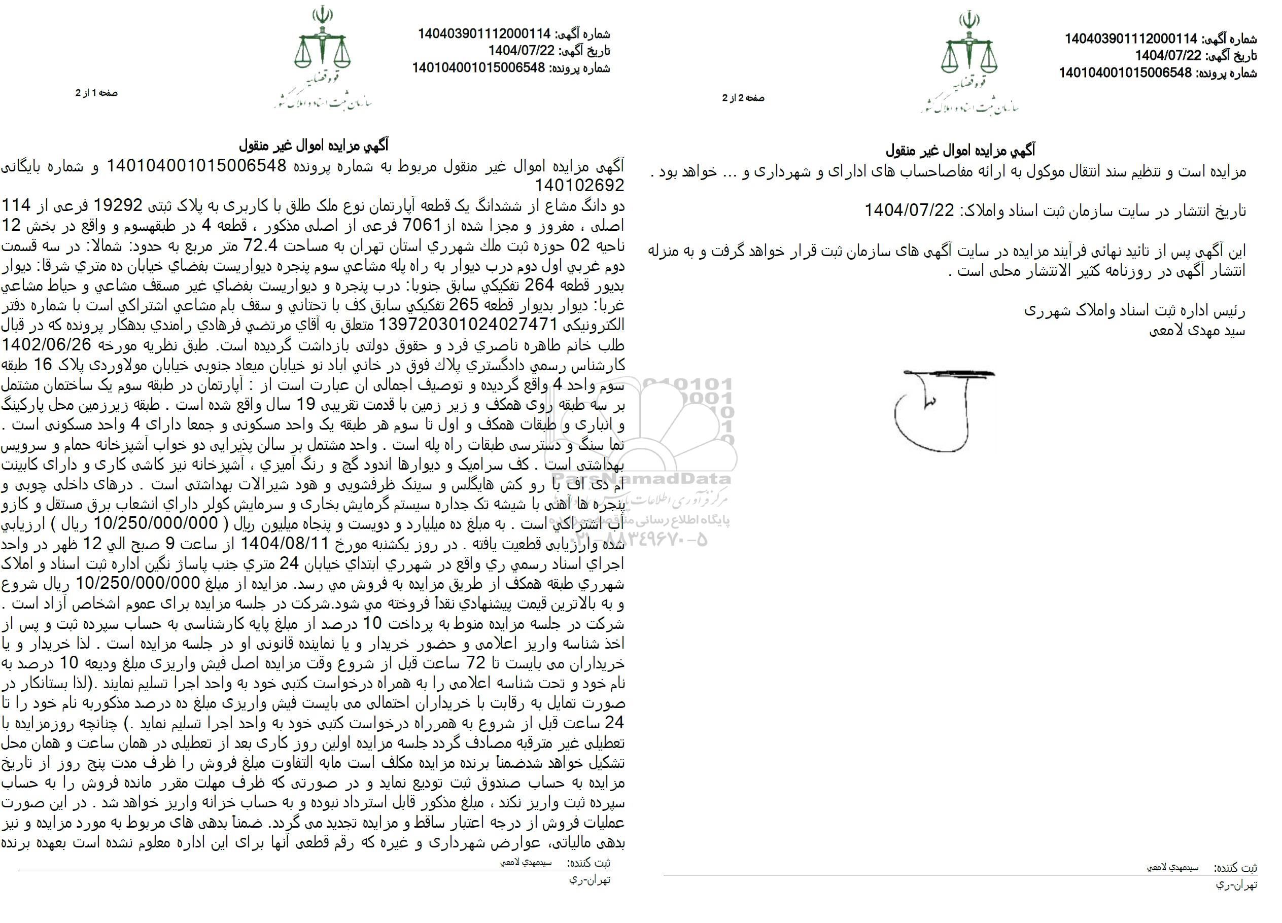 تاریخ انتشار در سایت سازمان ثبت اسناد و املاک: 1404.07.22