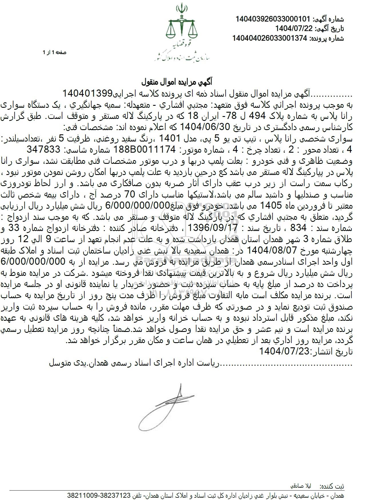 به موجب پرونده اجرایی كلاسه فوق متعهد مجتبي افشاری - متعهدله سمیه جهانگيري ، یک دستگاه سواری رانا پلاس به شماره پلاک 494 ل -78 ایران 18 که در پارکینگ لاله مستقر و متوقف است. طبق گزارش